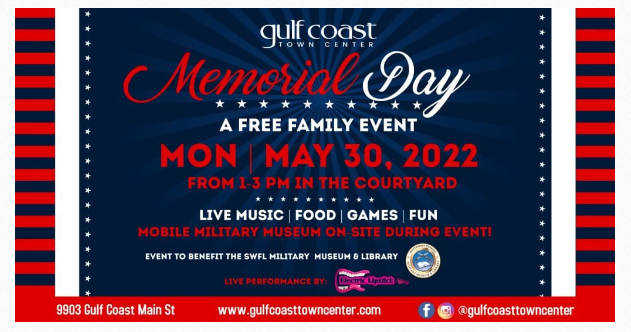 This Memorial Day, the Gulf Coast Town center is having a FREE family friendly event to celebrate and to raise awareness and funds for the SWFL Military Museum & Library. This event will include live music by Electric Lipstick, games, food, raffles and fun.
